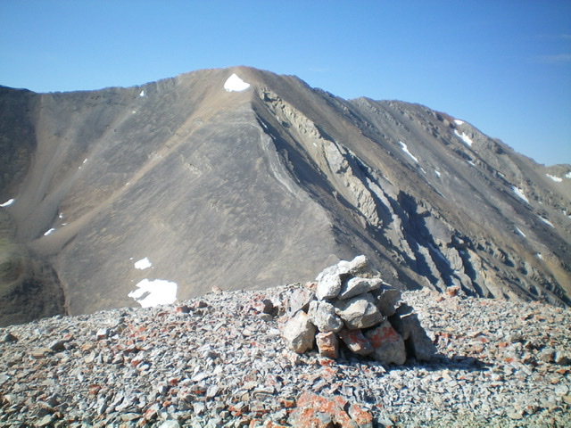 After getting to the base of the aretes, contour southwest on talus/scree to reach a gully just past the ridge problems. Climb back up to the ridge crest on loose, steep scree (brutal, on all fours at times) in a gully, then on crumbly aretes, and on steep, loose talus/scree/gravel high up in the gully, then finally on an arete to regain the ridge crest (Class 3+). Much to my surprise (and disdain), the upper ridge is not “smooth sailing.” It is actually a climb up steep, loose scree up to a cliff band high up (Class 3+ to climb up over). Once above the cliff band, there is more loose, steep talus/scree (as if on a face) then a final scramble up less-steep, firmer ridge rock to reach the small summit. There is a small cairn on top.