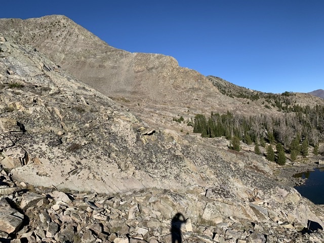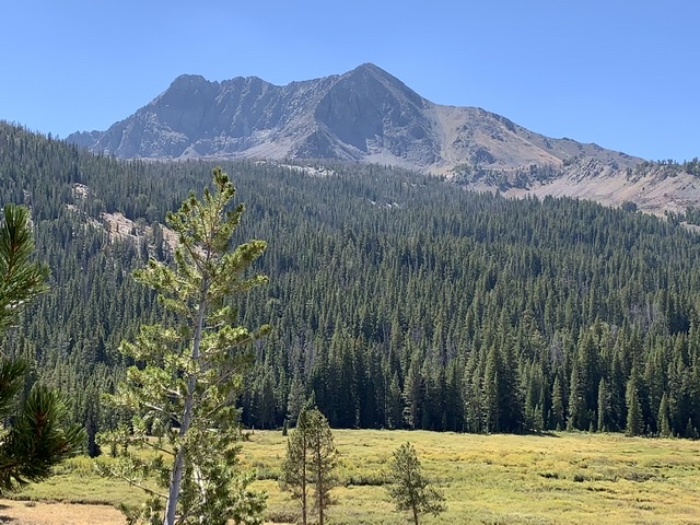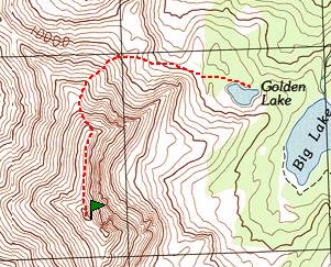 The peak can be reached from the east by climbing up the Lake Creek drainage and using the trail to Golden Lake. From here, climb west to reach the North Ridge of Atlas Peak as shown on George Reinier’s route shown below.