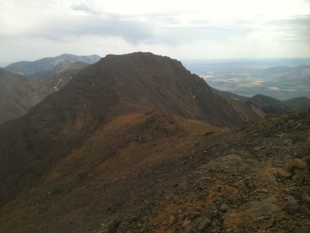Please note that this is NOT the standard Cabin Fork Canyon approach. This one starts in Elbow Canyon. You’ll really have to work to get South Twin done by this route. From the small saddle (10,540 feet) that connects North Twin and South Twin, climb up the ledge-y shale ridge outcrops, staying to the climber’s right/west of the ridge crest to avoid steep cliff bands. You will reach easier ground higher up and have an easy finish on the gentle summit plateau. The high point is at the southwest end of this flat summit area. I had no problems keeping this climb at Class 2. It is NOT of Class 3 difficulty unless you choose to make it harder than it has to be. The climb is just over 500 feet and takes a little over 20 minutes to ascend and just under 20 minutes to descend. You’ll get a good look at North Twin’s South Ridge from the summit (and North Ridge) of South Twin. That ridge is much tougher than this one. If you did the traverse from North Twin to South Twin, you will now wonder if you can get back up on top of North Twin. I know I did.