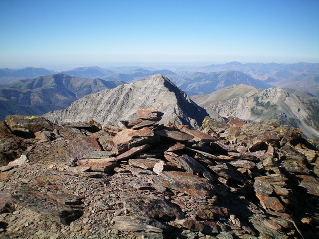 Go right/east here and follow a talus ramp (of sorts) at the base of the headwall to reach a shoulder that heads left/north directly at the crest of the southeast ridge. Head north up this shoulder and look for a scree/gravel chute to the left/west of the shoulder. Angle diagonally up and left/northwest to reach this chute then climb it straight north to the southeast ridge. The chute is quite steep and is mostly loose talus, scree, and gravel. Stay to the left side of the chute and grab the rib rock to help you advance. Once on the southeast ridge, scramble up the blocky ridge (using ledges a lot) to reach the summit of McIntyre Peak. There was no summit cairn so I built one.