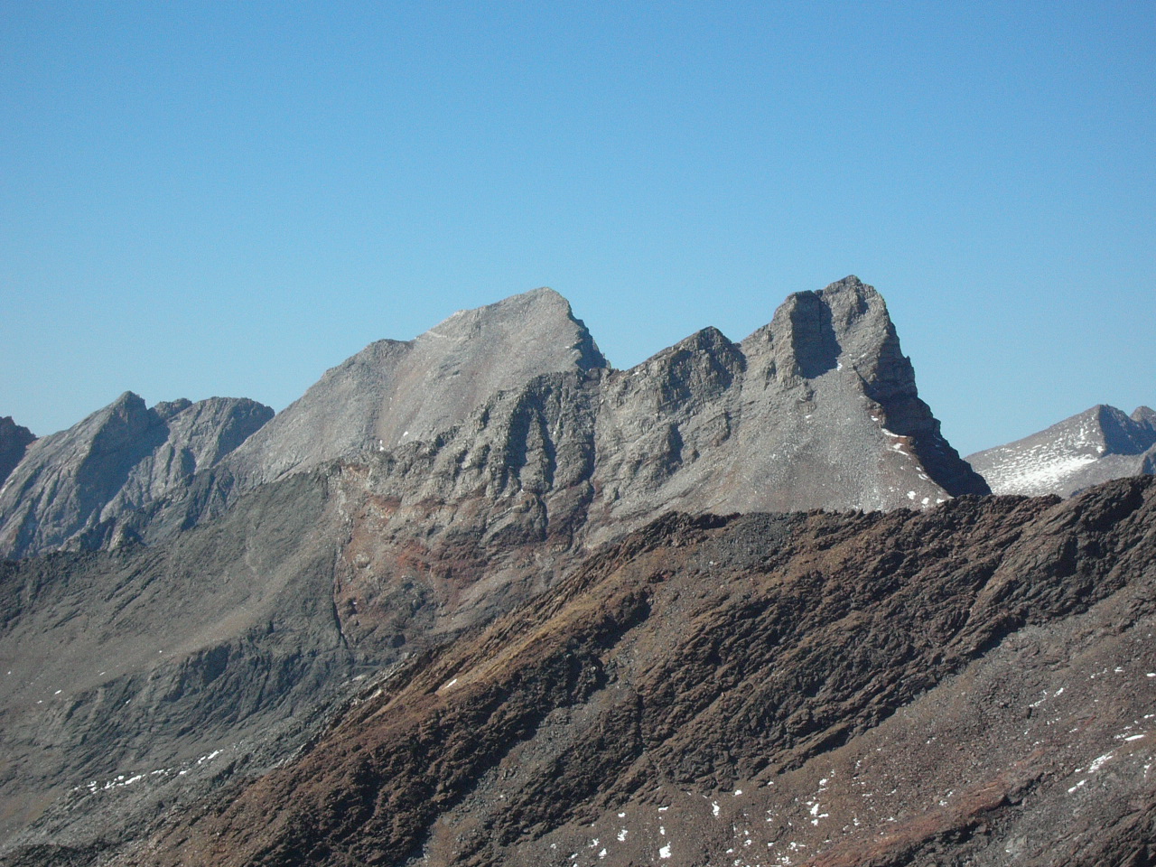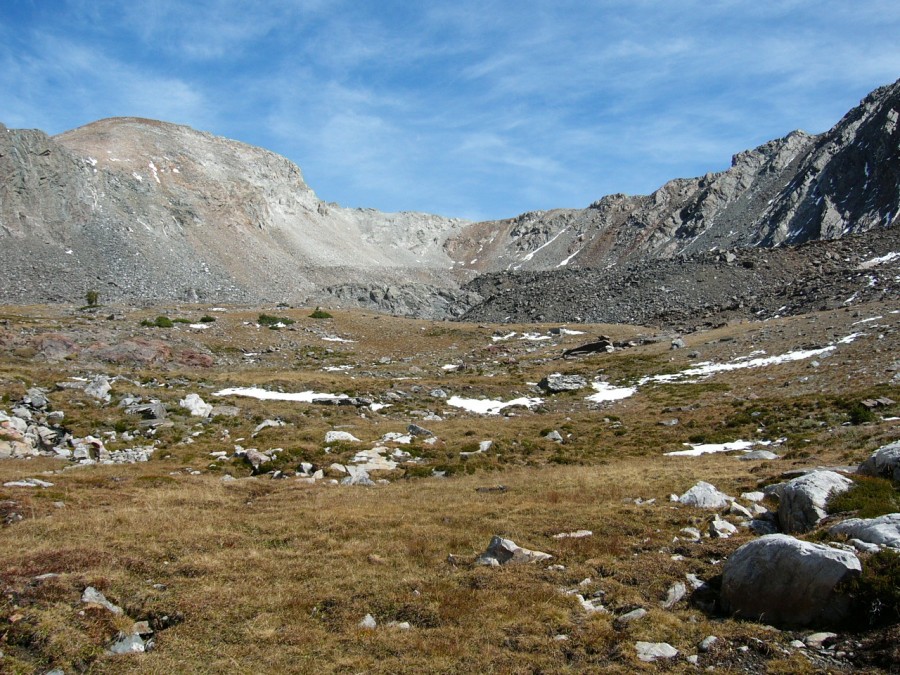 Approach the north ridge from scenic Big Basin [(B)(2)(b.2) on Page 259]. Big Basin is easy to traverse all the way to the talus field at the base of the north ridge. Climb the steep, blocky slope to the top of the ridge between Point 11020 and McIntyre Peak. Follow the ridge to the summit. The following photo essay shows the route.
