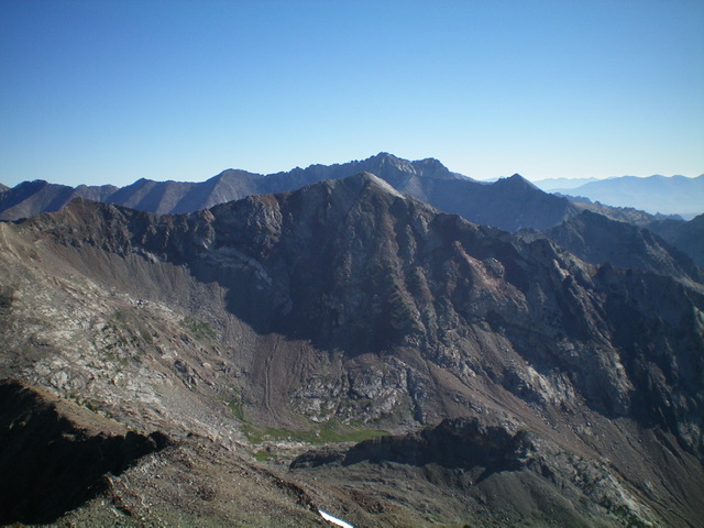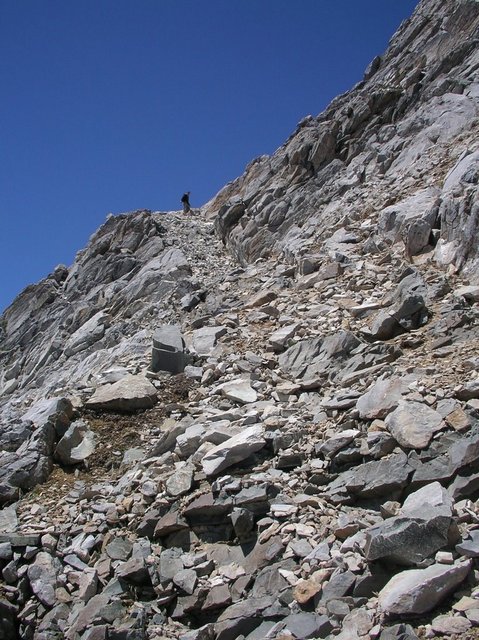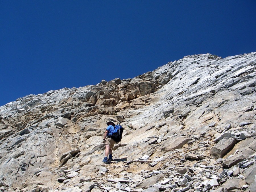 Follow the Johnstone Pass Trail north up the valley. At the 9,000-foot contour, the trail turns abruptly uphill. The route leaves the trail at this point, first crossing a somewhat flat meadow and then climbing up a talus headwall to the right of a cascading stream. At the top of the headwall, you are west of and directly below the summit. Steciak and Hamke ascended the gully on the south side of the face (shown in the photo below) to the top of the south ridge and then followed the ridge to the summit. Jason Floyd and I started up the gully. After gaining up roughly 200 feet, we exited the gully to the left, angling directly for the summit across steep, loose talus and rubble-covered slabs. Our line eventually reached a rib of broken granite which we followed to the summit. Round trip was 5.8 miles with 3,100 feet of elevation gain.