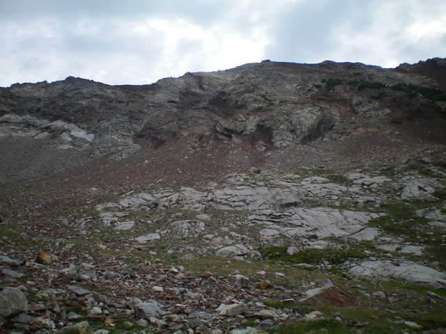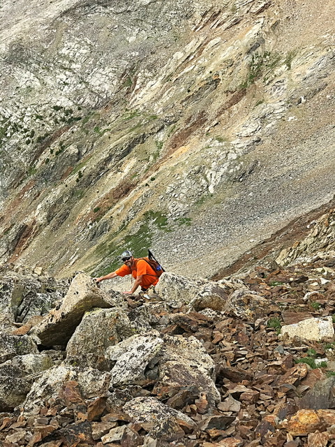From the middle of the meadow, head straight northeast up a scree slope to reach the mouth of the southwest gully. It is the most obvious gully in front of you, but it is no picnic. This is not the Steciak/Hamke gully. I’m not sure exactly where that one is but it must be left/west of it. The southwest gully has dark brown rock on both sides of it (initially) then on its right-hand side only (a little farther up). There were no other obvious gullies on the southwest face, only face rock (which may also be climbable). Once at the base of the gully, scramble northeast up the narrow, very loose rock in the gully (talus/scree and gravel) to reach a double chockstone that blocks the gully. Steciak/Hamke never mentioned this so it must be a different gully from theirs.