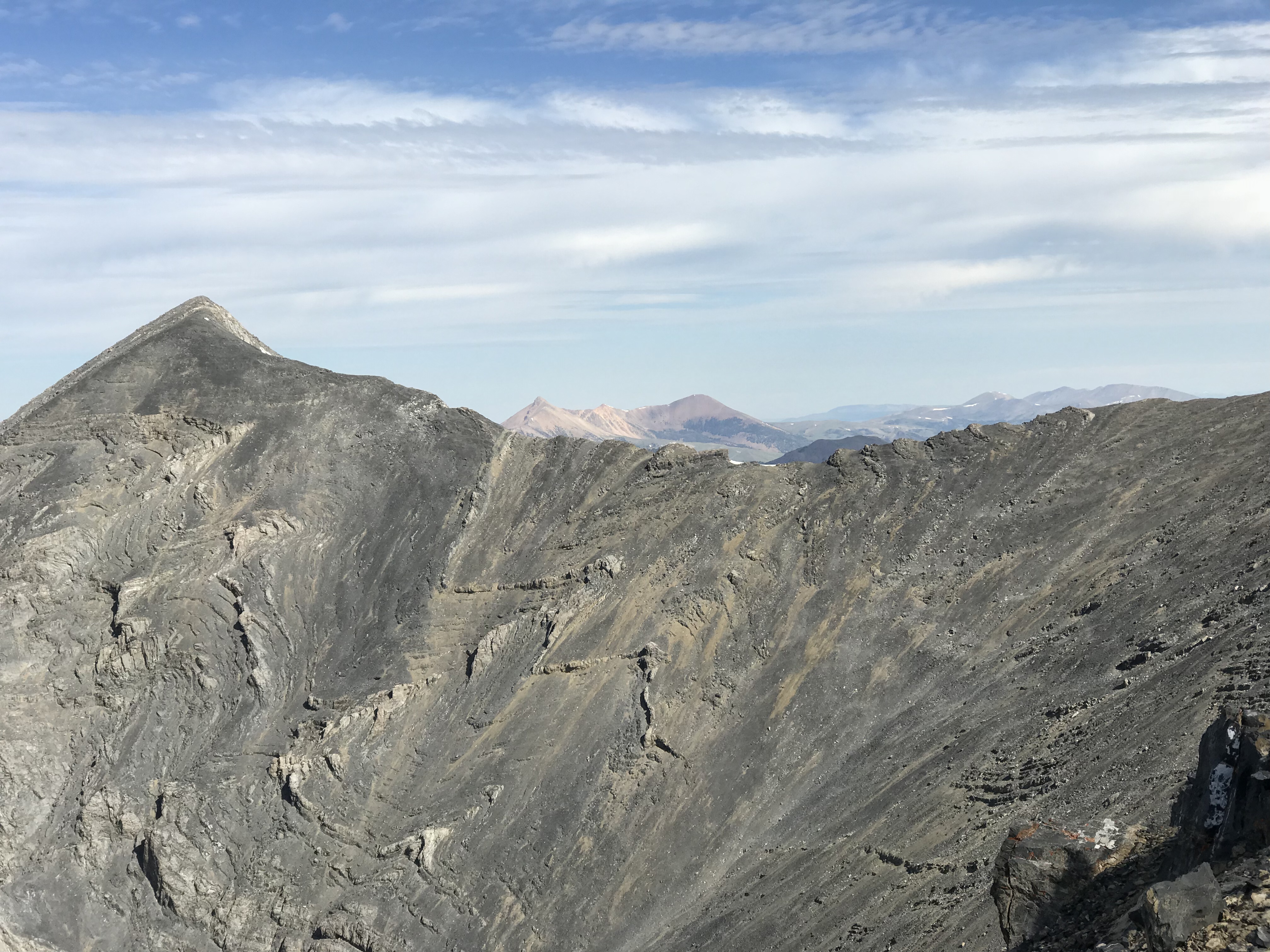 Descend west from Scott Peak on stable talus to the Scott Peak/Huhs Horn saddle. From the saddle, follow the East Ridge to the summit. There are numerous rocky steps along the way. They can all be bypassed on the south side of the ridge where there are broken goat trails.