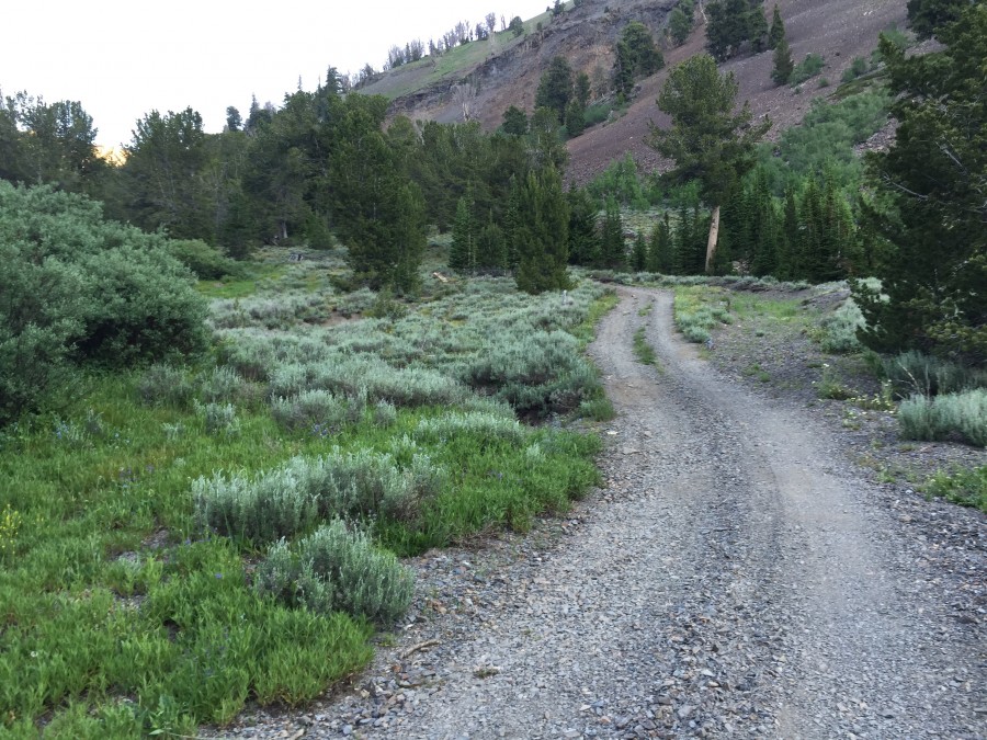 Little Fall Creek provides good access via a mining road that climbs up to 9,200 feet. As of June 2015, the road was blocked by two large fallen trees just above the second creek crossing. Most high-clearance vehicles (driven carefully) can make it to the first creek crossing. A 4WD will be necessary above the creek crossing, and many 4WDs will have difficulty crossing a large step on the talus slope above the first creek crossing. The road makes an excellent hiking trail. USGS Rock Roll Canyon
