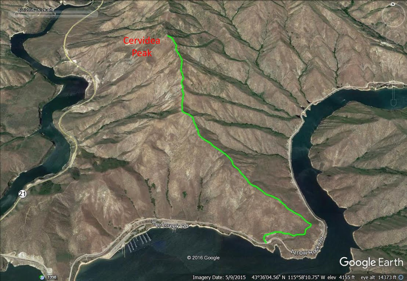 I first hiked to its summit in 1990 and have climbed it many times since and from many different directions. The summit register records climbs in most months. It is a hot climb in the Summer and there is no available water. The West Side Route from ID-21 (in the book) is no longer accessible because of a recently-installed deer fence. This page focuses on the most popular route (the Southeast Ridge). Also see John Platt’s trip report. USGS Arrowrock Dam