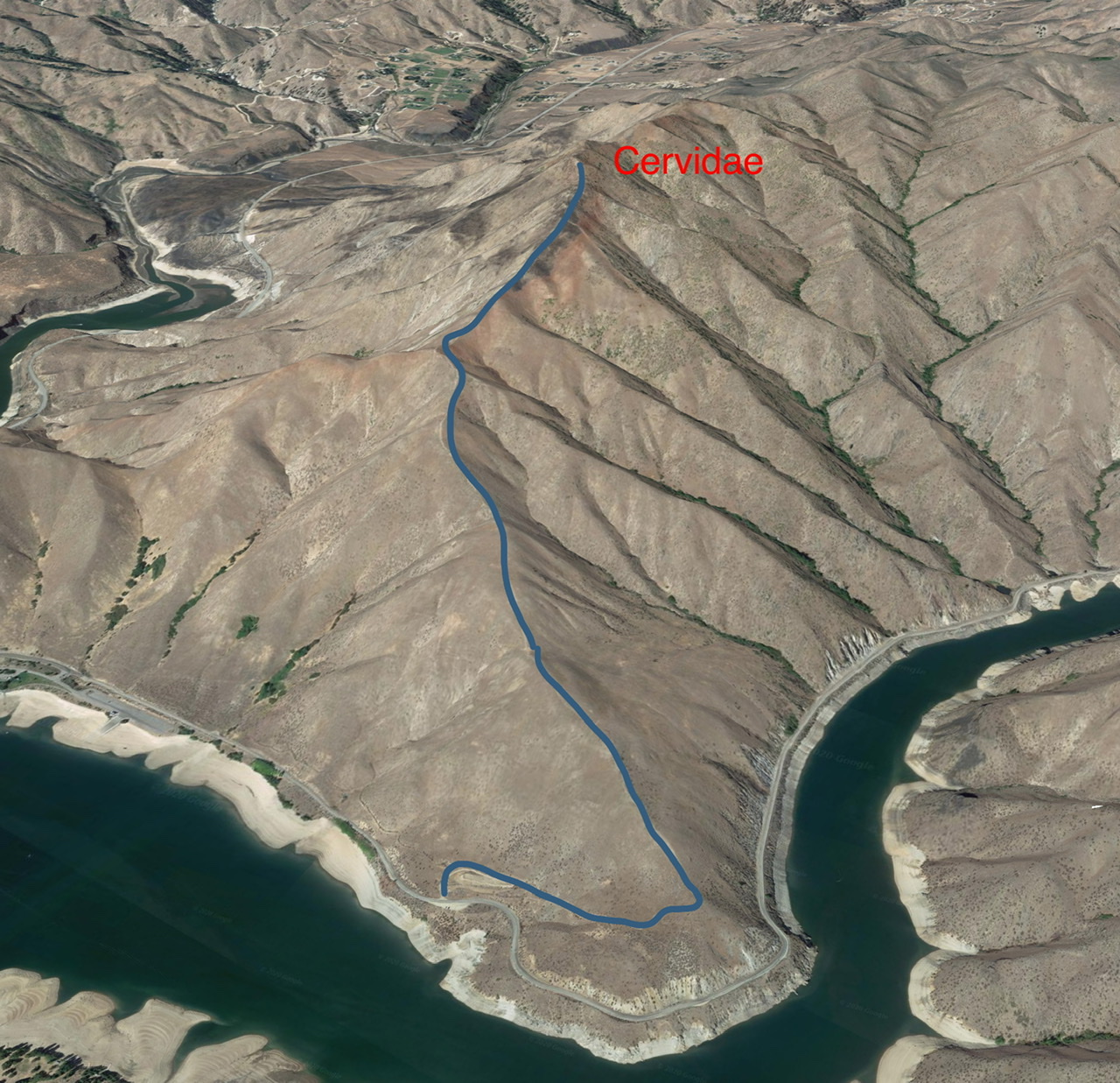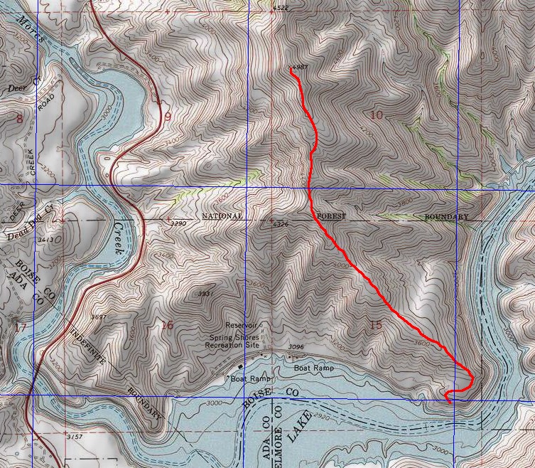 Cervidae Peak is located north of Lucky Peak Dam. ID-21 runs along the West Side of the peak and FS-269/Middle Fork Boise River Road runs along the East Side of the peak. Follow ID-21 for 6.1 miles past the dam. Turn right after crossing the high bridge over Mores Creek onto FS-269. Follow FS-269 past the Spring Shores Marina for 2.0 miles. There is a large, unsigned parking area on the right/south side of the road. The trail starts across the road. There is a large bar gate. Go past the gate, turn right, and walk into a bulldozed area. The trail leaves this area on your left.
