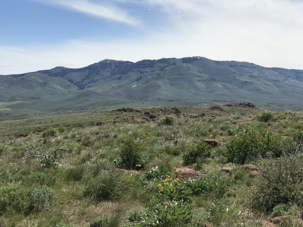 Park at an unsigned road junction and large parking area (4,932 feet) on the south side of US-20. GPS coordinates: 43⁰15’18”N, 115⁰32’40”W. This parking area sits at the base of the north face of Tollgate Butte. Bushwhack east briefly then south, heading directly at the summit ridge. The sagebrush slope isn’t too bad. After reaching the tilted summit plateau, scramble right/west up the ridge to reach the true summit.