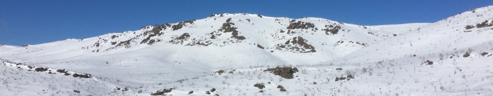 I snowshoed up the peak from the southwest with Dan Robbins. This route climbs up steep terrain so only do it when there is no avalanche danger. Take US-20 north from Mountain Home. Roughly a half mile past the Historical Marker, you will see a drainage splitting the hillside on the north side of the highway. This is your starting point. There is a wide spot along the highway on its south side about a quarter of a mile farther up. Park at that spot and walk back down the road, cross the guardrail, drop off the embankment and start your climb. Our route was 3.4 miles round-trip with roughly 850 feet of elevation gain.