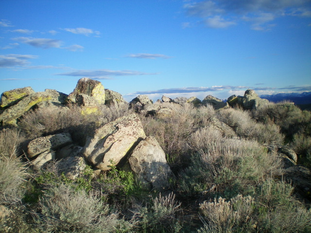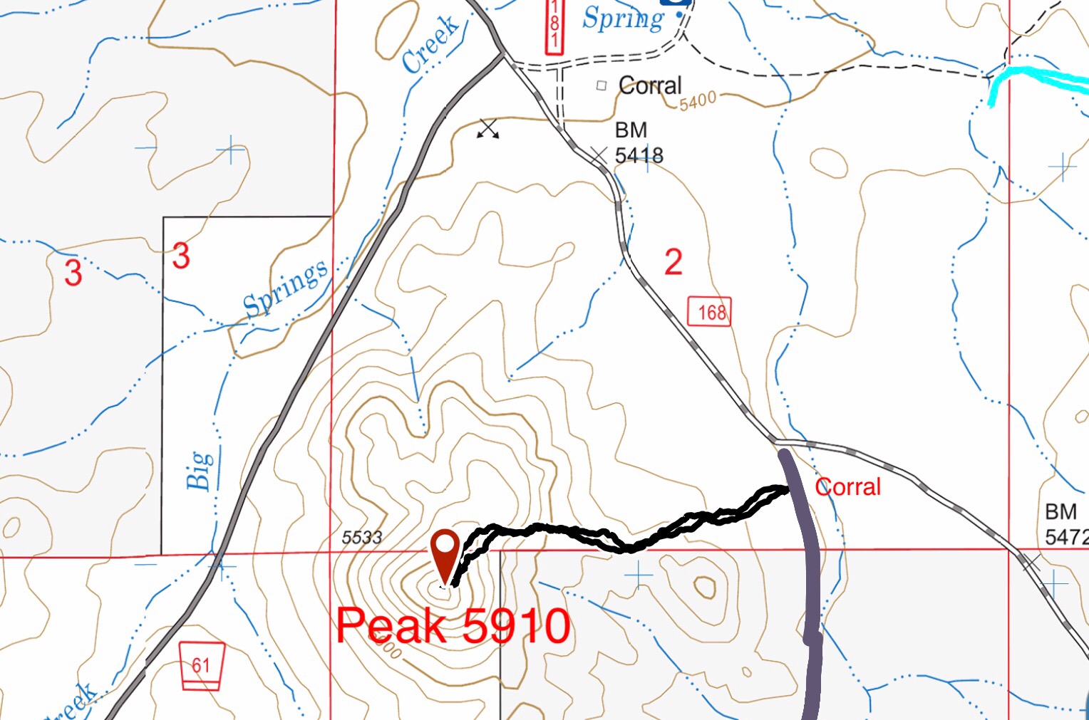 From the corral, simply head west aiming for the summit ridge just south of the high point. There is a lot of sagebrush but no other obstacles. When the slope steepens, you may find a faint game trail to follow. Just below the summit, you will encounter a few rocky slabs which can be bypassed on the left side.