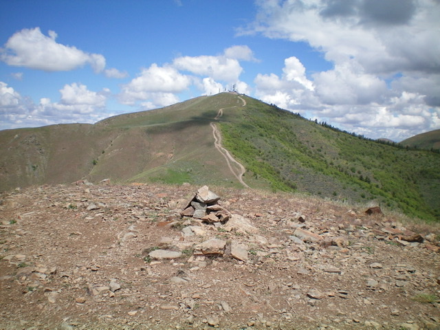 The bare summit offers outstanding views of Pocatello and Chinese Peak. The summit had no cairn so I built a nice one atop the ground boulder that is the high point. All of the trail junctions are clearly marked and they are all ATV trails and can be a bit muddy. Please note that the USGS map shows all of the ATV trails except for the final ATV trail that leads to the summit. For whatever reason, the USGS map is missing that critical one. Round trip stats: 4.5 miles with 1,625 feet of elevation gain.