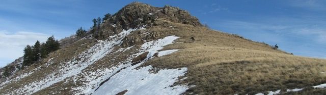Scramble south up the magnificent spur to reach its junction with the [obvious] west ridge. The summit of Self Help Peak is the rocky outcrop off to the left. The west ridge is broader and has more scrub than the north spur. Follow the west ridge directly up to the summit rocks (Class 2+). Work through the large boulders and brush to reach the small, grassy summit of Self Help Peak. There is a memoriam nearby on a lower boulder (football helmet and plaque). I rebuilt the summit cairn and placed it atop the highest boulder.