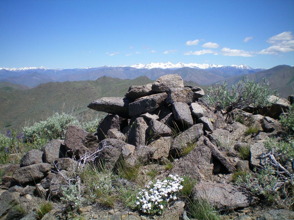 From the 6,820-foot connecting saddle, scramble south over a ridge hump and down to a final saddle. Continue south to reach the gentle east summit (high point) of Peak 7174. The terrain on the north ridge is open sagebrush and short scrub. There is very little ridge rock to contend with. There are some cattle/game trails to help expedite the ascent. This ridge climb goes quickly. The east summit of Peak 7174 is a gentle hump with some boulders on it. It has a decent summit cairn and some triangulation wiring nearby. The west summit is markedly lower (7,144 feet) than the east summit (7,174 feet).