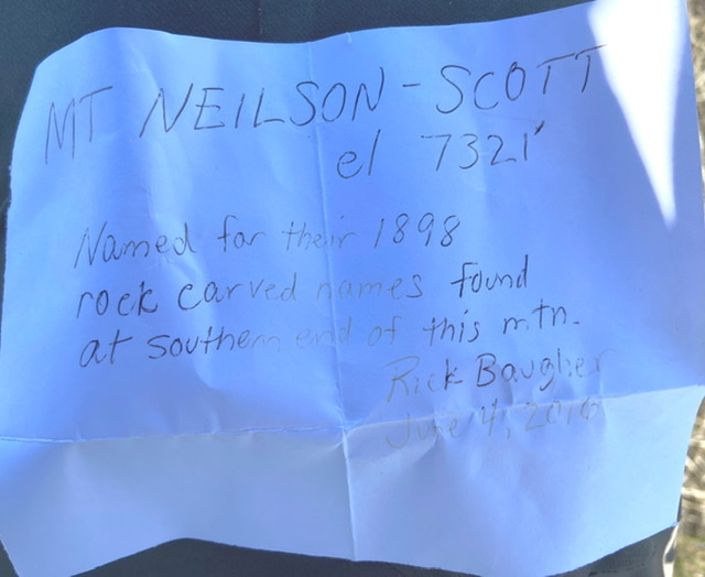 This peak is the northernmost Sublett Range peak to reach above 7,000 feet. The view from its summit extends all the way across the Snake River Plain to the Pioneer Mountains, the Lost River Range, and the southern Lemhi Range. The name was suggested by Rick Baugher and is based on a rock carving made by Neilsen and Scott in 1898. Rick found the rock on the peak’s slopes (see the photo below). USGS Hartley Peak
