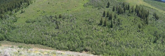 “Goodheart Peak” (7,550 feet elevation) was about the only summit I’ve found on the Schmid Ridge to be unoccupied (of sorts). On 6/23/13, I pulled off the Slug Creek Road and parked just south of what shows as the Knudsen Ranch on the Dry Valley quad. It’s now just an historically preserved barn. From here, I dirt biked east on a primitive BLM road that degenerated to a cow path. Parked at “Lonetree Saddle” (6,918 feet) inside the Caribou National Forest. With a street vehicle, I would have hiked the latter half of this two-mile stretch.