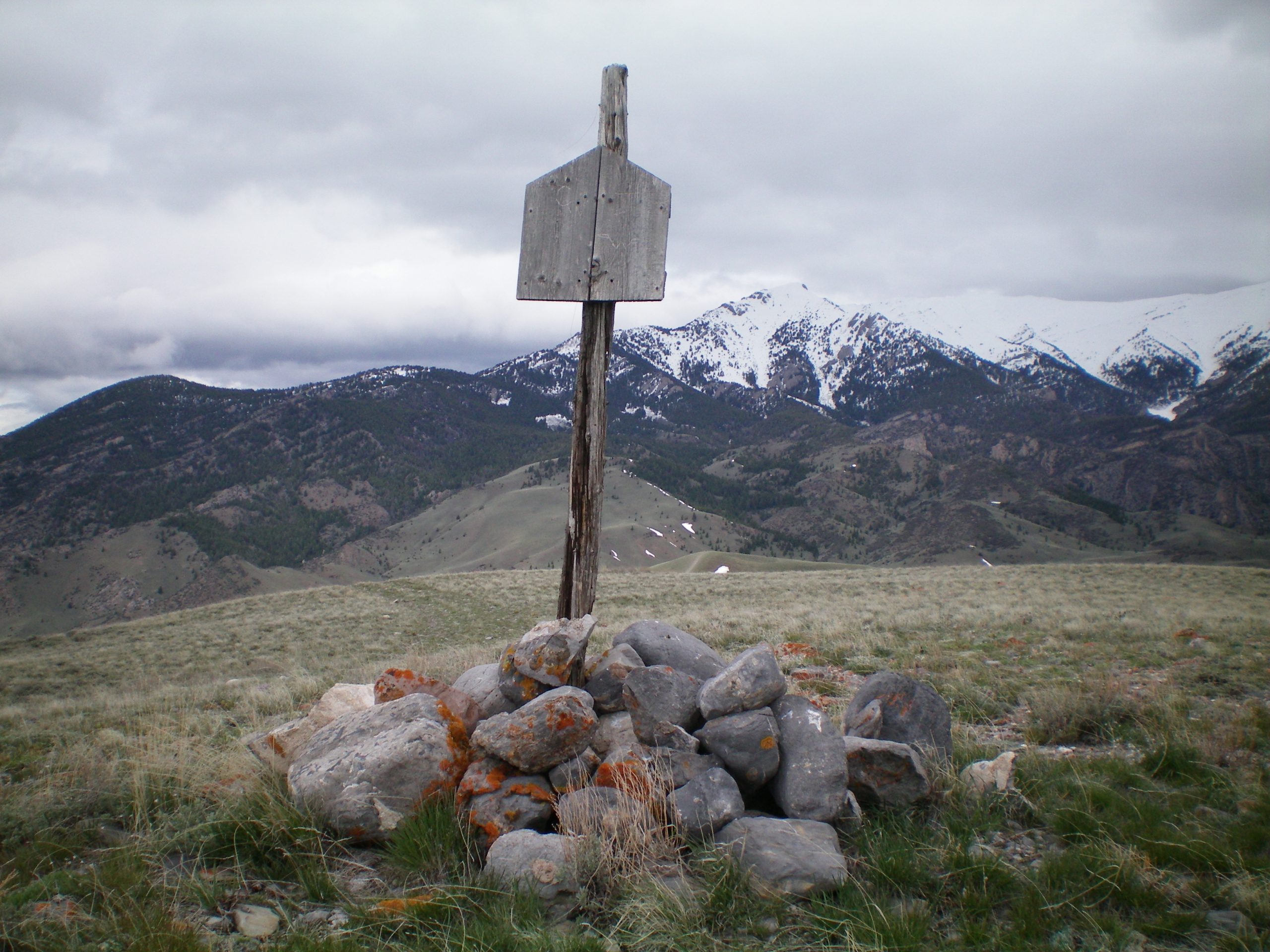 From the parking pullout, hike up the muddy, rutted road to Arco Pass for 2.0 miles to a flat saddle area at 7,000 feet. Do NOT go all the way to Arco Pass. Leave the road here and scramble east up a relatively easy mix of sagebrush and grass. You soon reach Point 7535 (large cairn here). Follow a 2-track jeep road southeast then east to the summit of Peak 7768. The summit of Peak 7768 has a large cairn. I stuck a post in the cairn and took a photo of it. Peak 7768 is just another grassy hump and nothing more.