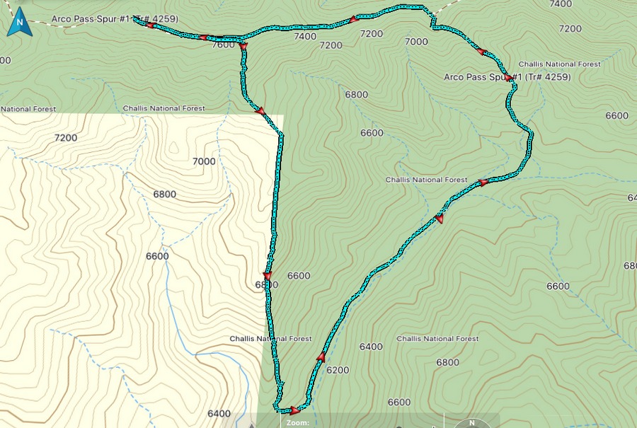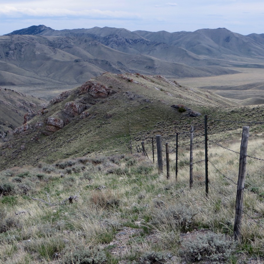 From the summit, descend west on the 2-track road briefly to reach the southwest ridge. Leave the jeep road here and descend the crest of the southwest ridge. The terrain on the southwest ridge is easy open scrub/grass. The ridge soon bends right/west and drops 600 vertical feet to a gully. Descend the narrow gully (using a cattle trail) to intercept Arco Pass Road. You must cross a stiff cattle fence a little ways above the road. Follow the road back to your parked vehicle.