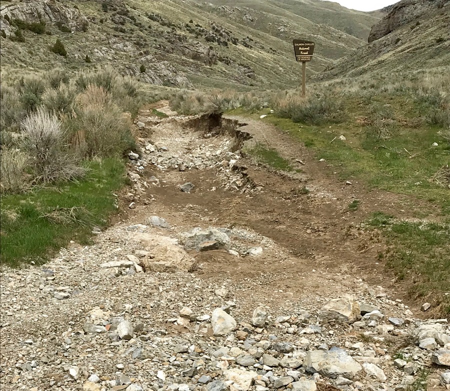 Normally, you could continue on the dirt road farther into Wood Canyon. However, during winter of 2017-2018, a heavy rain event washed out many approach roads in the Jumpoff Peak/Arco Hills area. We found this ATV road impassable by 4WD without causing irresponsible resource damage on top of natural damage, so we parked and started our climb from here.