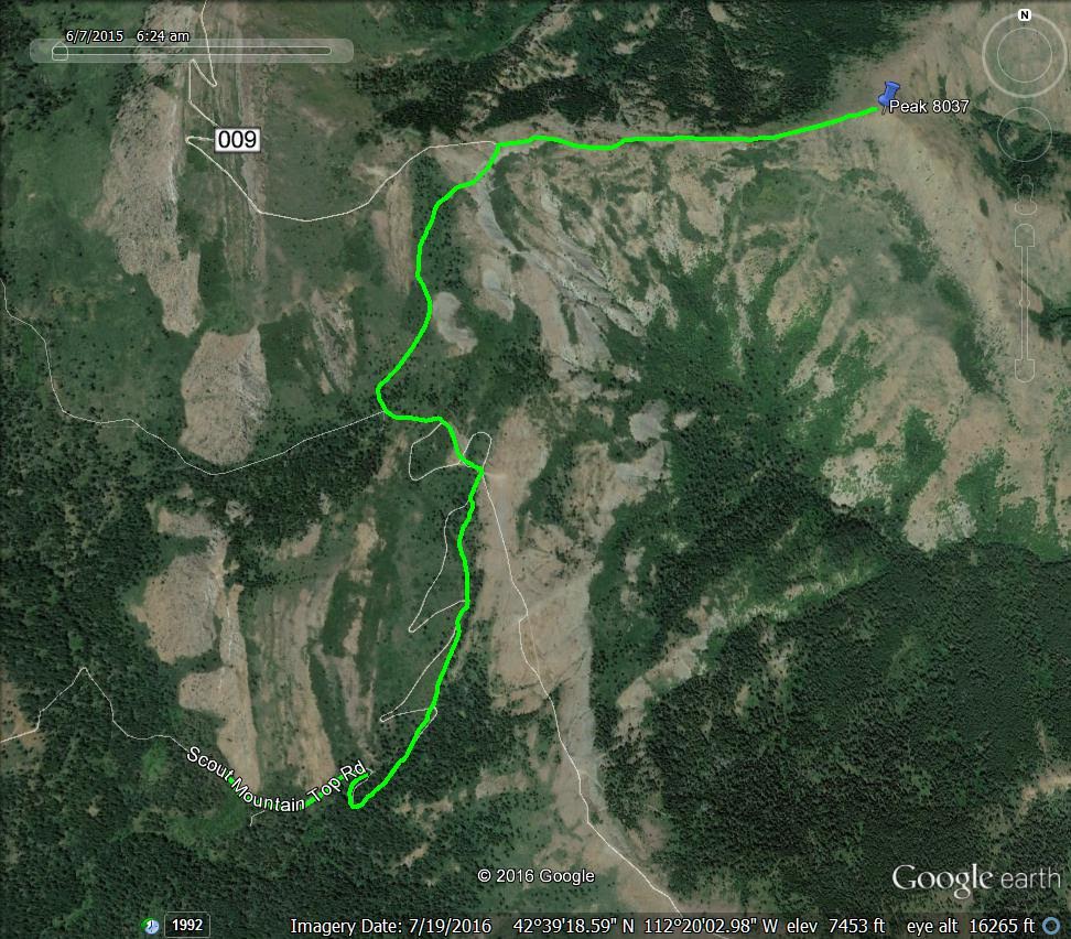 Goodenough Peak, also known as Peak 8037, lies southeast of Scout Mountain in the Bannock Mountain Range within the Caribou-Targhee National Forest. This peak can be accessed from multiple directions. USGS Scout Mountain