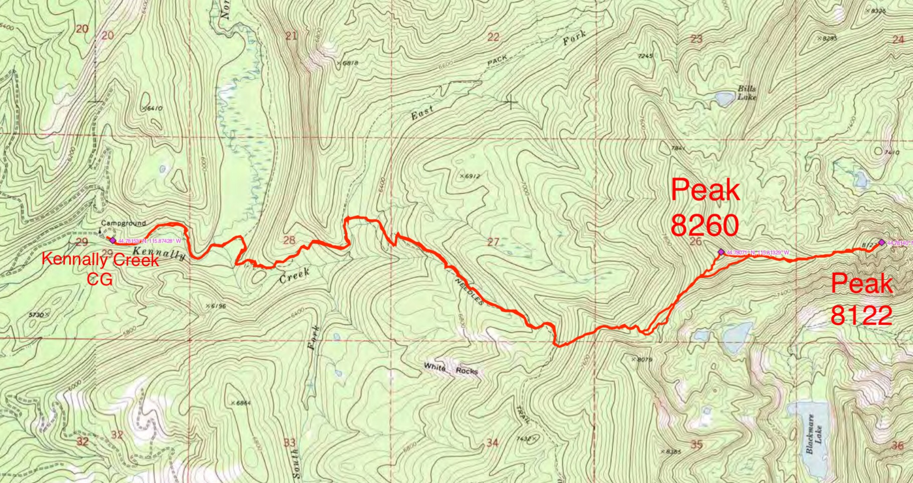 Peak 8260 is located southwest of McCall on the main Lick Creek Range Crest and NNW of Blackmare Lake. This area is remote from an access standpoint. USGS Blackmare