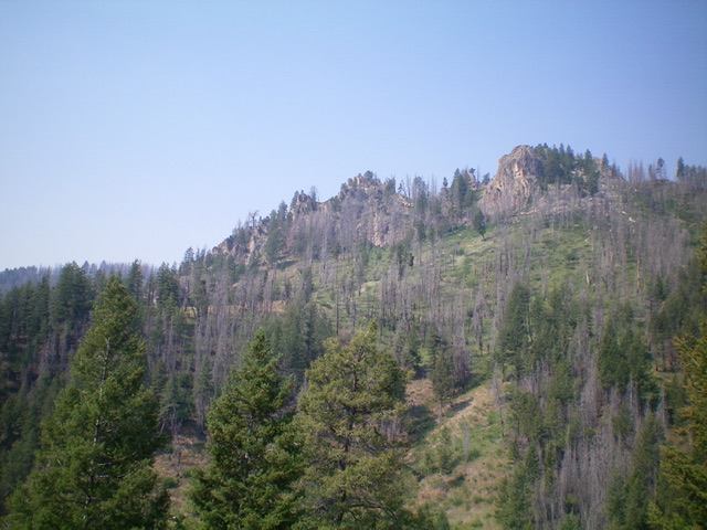 From the trailhead, bushwhack west up through the forest briefly to reach the visible and obvious crest of the southeast ridge. Follow the steep ridge crest on scrub, loose scree/gravel, and scattered pines to reach rockier terrain pretty quickly. Begin a long, tedious scramble up through endless rocky outcrops, cliff bands, and ridge towers to reach a flattish ridge area at about 7,400-7,425 feet. The low- to mid-section of the southeast ridge requires a lot of weaving around blocks/towers and up chutes and face rock. The ridge rock is firm but any rock (talus/scree/gravel) laying atop the ground is loose. The terrain is steep with little upward visibility, if any. You must skirt the base of some of the ridge blocks/towers.