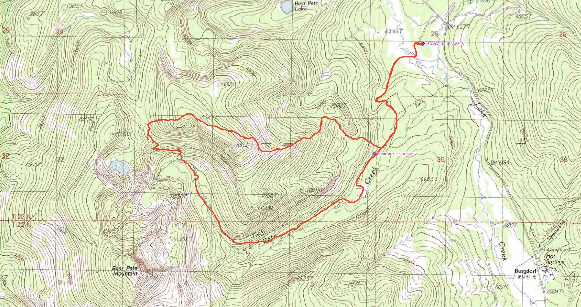 Peak 8375, more commonly known as Pete Creek Peak, sits between Bear Pete Mountain and Toller Peak on the long divide that rises up west of Lake Creek and Burgdorf Hot Springs. USGS Burgdorf