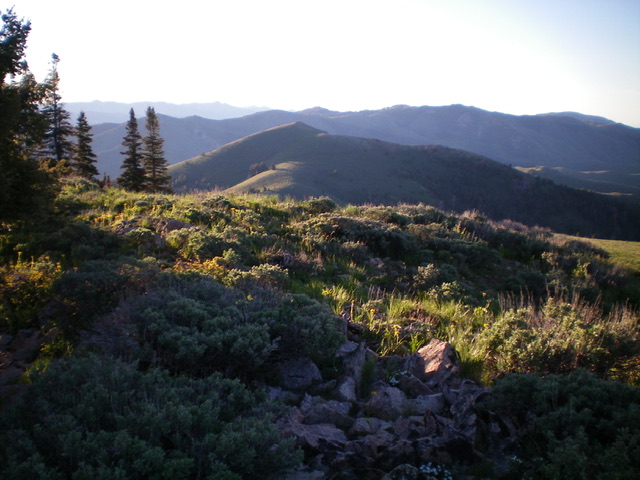From the parking pullout/saddle, hike southwest up the remnants of a 2-track road (which soon fades to a horse trail, if any trail) which follows the curving east ridge. The ridge bends right/west then right/northwest to reach the summit in a steep climb up a badly rutted “trail.” The ridge works its way around a prominent gulch to its right/north. It is important to avoid that gulch on the descent so that you don’t end up below the saddle from which you started. The ridge also avoids much thicker sagebrush that clogs the gulch. When there is no trail, the sagebrush on the ridge crest is not too difficult to bushwhack. The summit of Basque Peak is a small, rocky outcrop with a modest cairn.