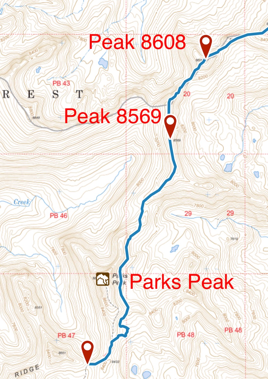 The traverse from the Parks Peak Trail is a bit convoluted. The GPS track shows the line I followed, but there are other options available. Leave the trail at the 8,400-foot contour, drop off the ridge and descend to the saddle shown below. The track shown below detours around some deep, rotten snow I encountered. In dry conditions, this detour is not necessary. Drop into the drainage and stay along the base of Parks Peak’s Northeast Ridge as much as you can, aiming for the pass between the two peaks. There are a couple of large boulder fields to navigate over or around, depending upon your preference. Once on Peak 8569’s Southwest Ridge, it is an easy walk to the top.