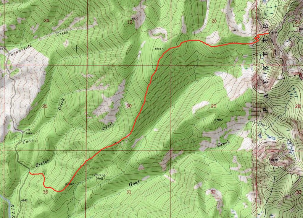 Goat Creek Peak is located above a drainage named Goat Creek. More specifically, this Goat Creek flows west off a high ridge known as the Log Mountain/Deadwood Divide (see Page 117 of the book). Even more to the point, the peak is located on the section of the divide bordering the East Side of the South Fork Salmon River between Warm Lake and the junction of the South Fork and the East Fork South Fork Salmon River. Goat Creek Peak sits on the Divide’s crest roughly 2.0 miles SSW of Log Mountain. USGS Log Mountain