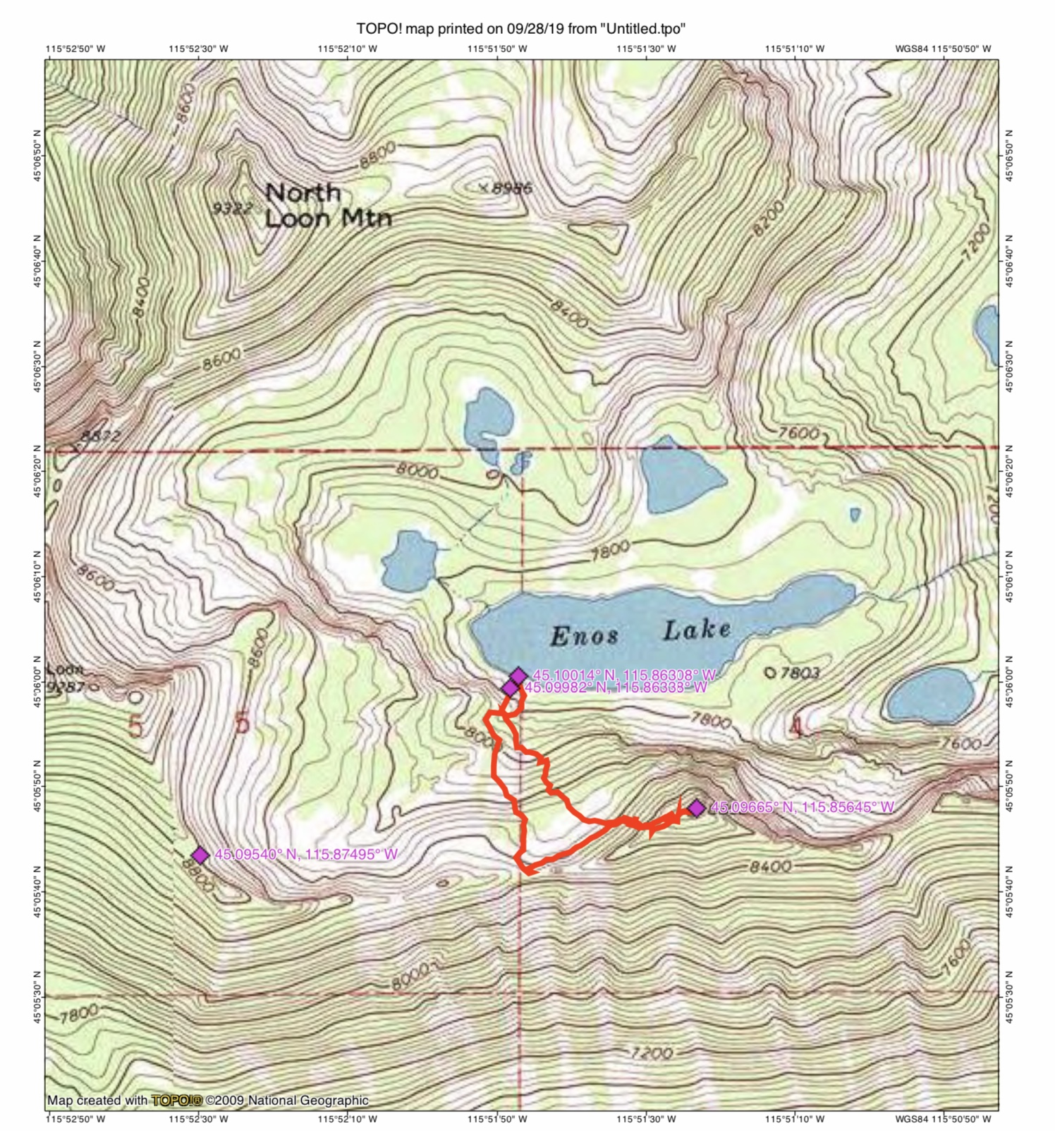 From the lake, traverse over to FST-082 [(B)(3)(d) on Page 136]. Follow FST-082 up to South Loon Saddle (8,056 feet). From the saddle, start up the South Ridge of South Loon Mountain. After gaining roughly 200 vertical feet, start a climbing traverse across the South Face of South Loon Mountain. Aim for a crossing of the peak’s Southeast Ridge at just over 8,800 feet. Cross the ridge and descend to Enos Lake. See the map below and use the link below to read John Platt’s trip report. This route covers 7.9 miles with 3,250 of elevation gain. Note: An alternative route to the upper Loon Creek drainage is to hike to Hum Lake and then from Hum Lake to Loon Creek [(B)(3)(d) on Page 136].