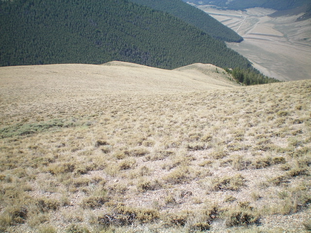 From the summit, follow a 2-track road south to the saddle just north of Point 8836. Leave the road here and scramble south to the top of Point 8836 through scrub, talus, and rocky outcrops. From Point 8836, follow the ridge crest south on superb terrain of open grass and scrub all the way down to an obvious spur ridge that bends right/southwest to head down to the valley floor. This spur ridge follows the north side of a gully that leads west to Doublespring Pass Road.