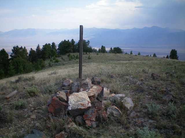 From the 8,500-foot connecting saddle with Peak 8860, follow a weak 2-track road (not shown on maps) northwest over a shoulder and down to another 8,500-foot saddle. Continue hiking northwest along the road until it reaches the south ridge of Peak 8937 at a ridge saddle just north of Point 8836. Hike north on the 2-track to reach the summit of Peak 8937. The summit has a large tree and a decent cairn with a post in it.