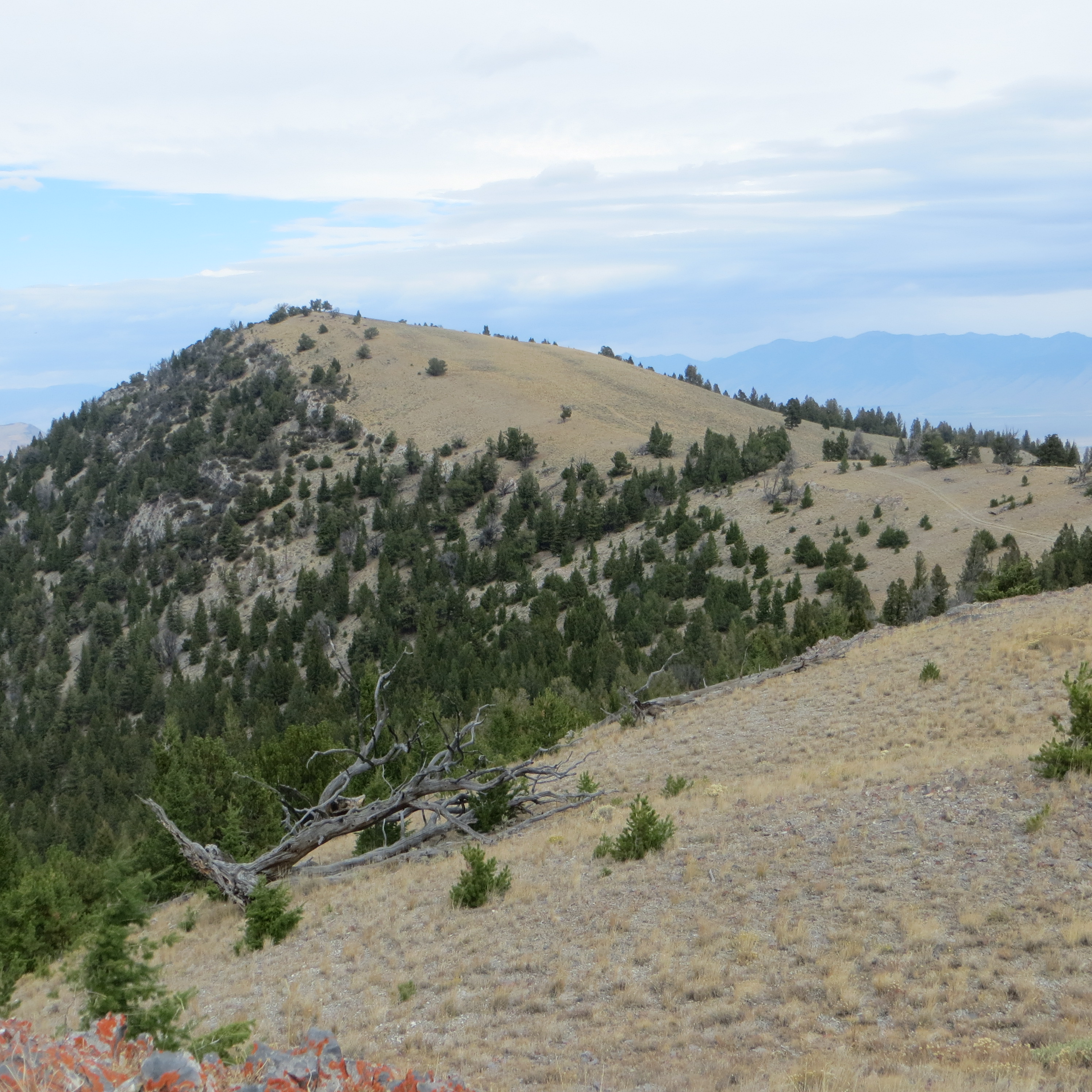 The lower part of Peak 8937 is also the steepest section. However, it is short and the footing is excellent. There is no trail on this peak, but the route is straightforward. Once you reach the top of the lower ridge, continue east then north toward Point 8836, staying on the east side of the trees. Skirt Point 8836 and continue north to the summit of Peak 8937. As you proceed, you intersect a faint jeep trail that goes close to the summit. There is a small cairn on top.