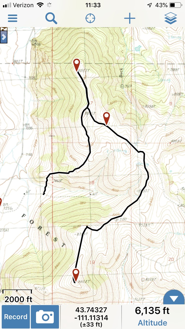 We combined our climb of Peak 8937 with Peak 9053 to the south. Our GPS track below is missing the descent from Peak 9053 to our vehicle. We descended via the west gully, right near the “T” in Forest on the track. From the summit, you have nice views of the north side of both Mount Borah and Mountaineer Peak as well as other surrounding 10K and 11K peaks.