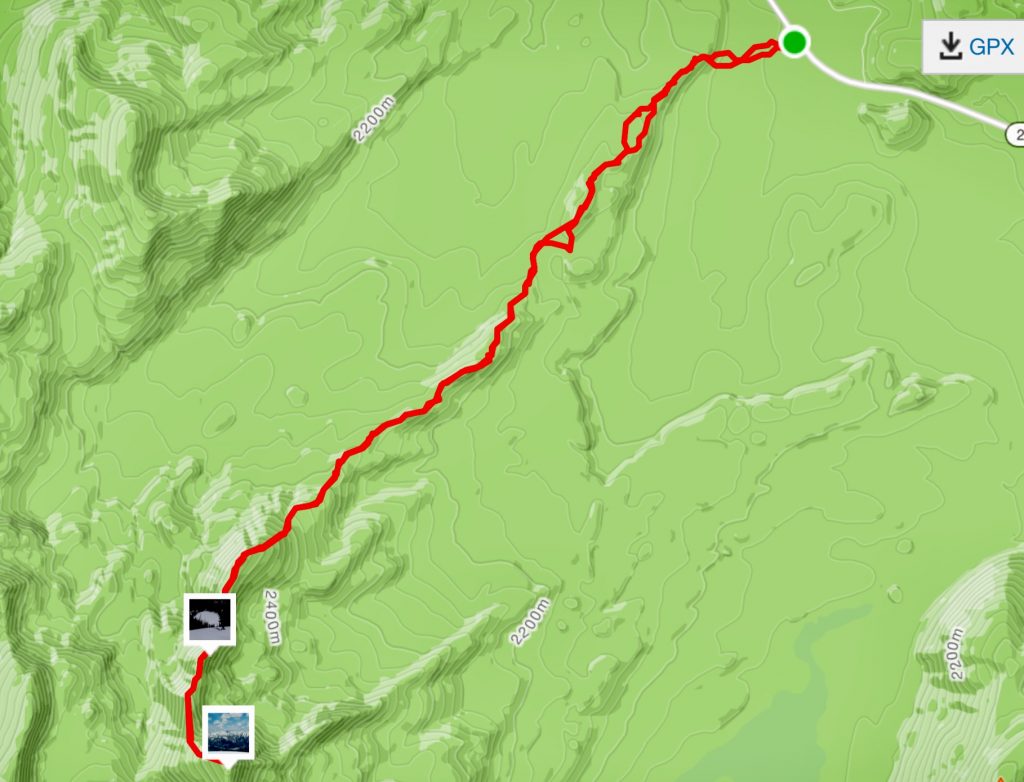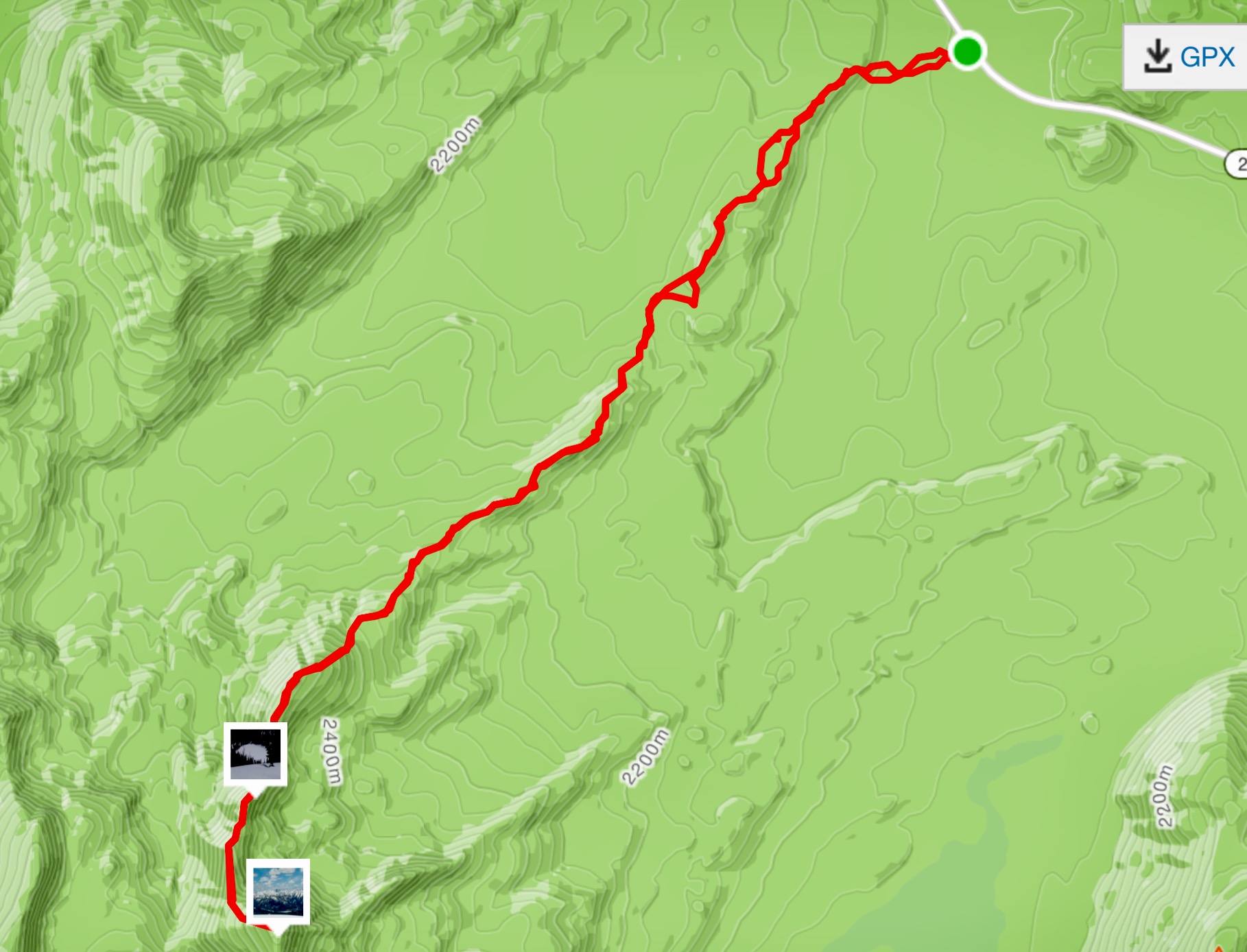 In May 2017, I started my hike at the Trap Creek Campground and headed northwest to gain the ridge between Trap Creek and Meadow Creek. The ridge is quite gradual and drops about 20 feet before reaching 7,500 feet. For a short section, the ridge steepens before leveling out at 8,300 feet. After that, it is a fairly easy hike or snowshoe to the summit. With wind drifts along the ridge, I stayed on the north and west sides of the ridge. The summit views are superb and well worth the long approach.