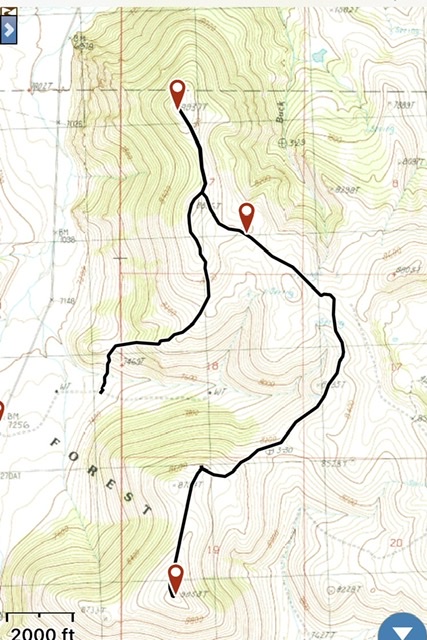 We combined our climb of Peak 9053 with Peak 8937 to the north. Our GPS track below is missing the descent from Peak 9053 to our vehicle. We descended via the west gully, right near the “T” in Forest on the track. You can also ascend this gully, but it is steeper than the north approach. From the summit, you have nice views of the north side of Mount Borah and Mountaineer Peak as well as other surrounding 10K and 11K peaks. You might also catch a rainbow.