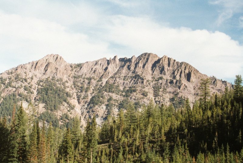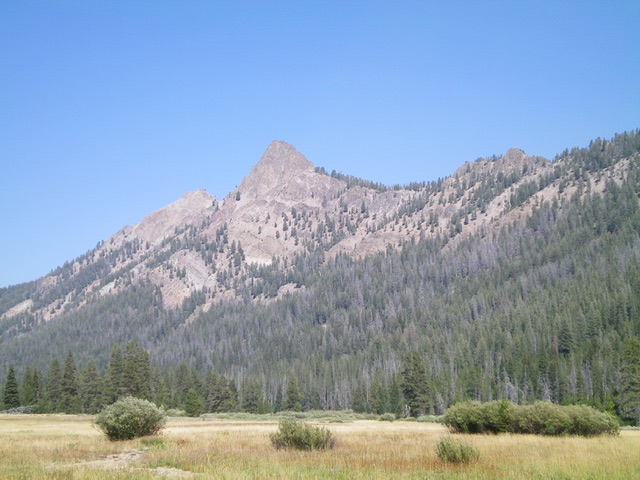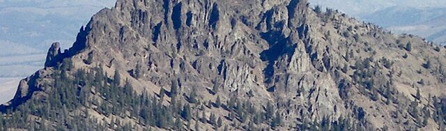Climbing and access information for this peak is on Page 202 of the book. From personal experience I can state that the route in the book does not work as a Class 3 climb as it encounters impossible towers of rotten rock. Livingston Douglas has provided the definitive update for this peak which includes a detailed update of the East Face/South Ridge route listed in the book and rates the route Class 4 and the Southeast Chute/East Face route which he descended as well as information about the Ross Fork Fire’s impact on the peak. Derek Percoski provided a photo showing his ascent line up the Southeast Chute/East Face route. Updated November 2022