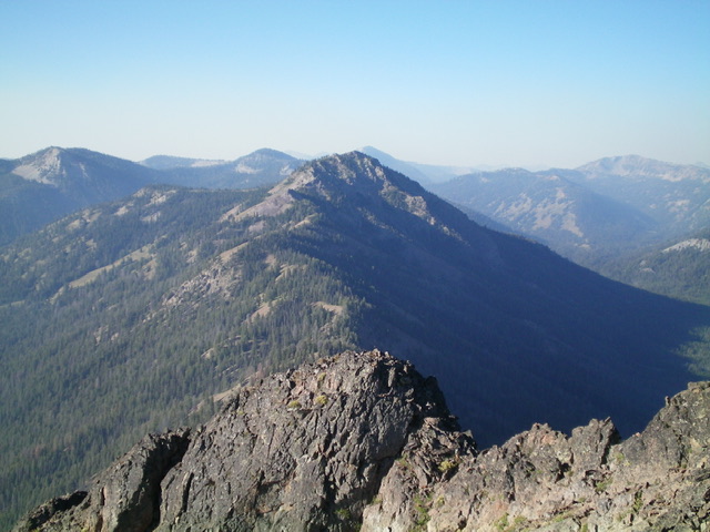 From the campsite, cross to the west side of Frenchman Creek Road and scramble west up a steep, open slope of scrub, gravel, and scattered pines (not too loose) to reach semi-forested Point 9027, crossing an old mining road twice on the way. From Point 9027, descend north down through an easy pine forest, dropping 50 feet to find a semi-open saddle and a narrow ridge that heads northwest to Peak 9495. The climb up from the saddle is in open scrub and loose gravel. Stay to the right/northeast of the face near the edge of the ridge for best traction. Peak 9495 is a ridgeline summit with a decent cairn.
