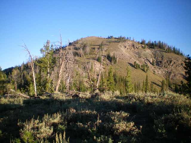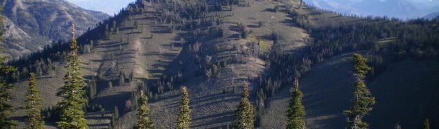 From ID-75, turn left/south onto poorly-signed Frenchman Creek Road/FSR-195 (this turnoff is 0.3 miles west of the [signed] Salmon River Road turnoff). Reset your odometer at the start of Frenchman Creek Road. At 1.0 mile, go right at an unsigned junction. At 5.1 miles, reach the end of the road and a dispersed campsite on the left side of the road just before the road blockage. There isn’t much parking space at the road’s end, so the campsite makes for a good, safe place to park (7,865 feet). GPS coordinates: 43⁰49’00”N, 114⁰47’36”W. This is the first leg of a 5-peak adventure that includes Peak 9495, Peak 9303, Peak 9599, Peak 9540, and Peak 9818.