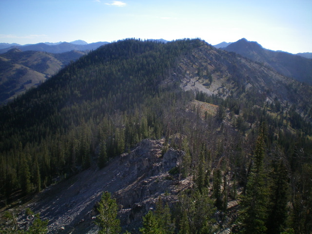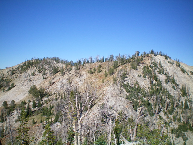 From the 9,180-foot connecting saddle with Peak 9599, scramble east up the semi-forested ridge on somewhat steep, loose scree/gravel to reach Point 9526 (cairn here). While not the official summit, it measures five feet higher than the official summit to the north. Bushwhack north through a forested area of both live pines and burnt snags down to a minor saddle then up to the official high point, which is a tall pine tree with a small cairn next to it.