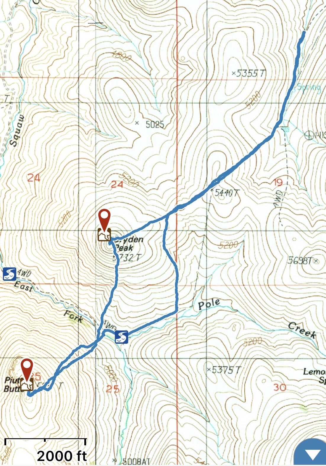 To climb the peak from the Coyote Grade Road and Rodeo Gulch, hike up and over Point 5440 and then descend down to the East Fork Squaw Creek. Note that there is a section of private land in the bottom of Pole Creek that must be avoided. Cross the East Fork Squaw Creek and then climb up toward the base of the East Face cliffs. Follow the base of the cliffs south until you reach the obvious notch on the South Ridge. Climb into the notch and then follow the ridge north to the summit. There is one Class 3 step along way. The route shown on the GPS covers 5.3 miles and 2,500 feet of elevation gain round trip.