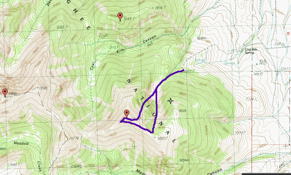 This is a shorter and steeper route than the routes described in the book. Drive midway between Coal Kiln Spring and Box Spring on the two-track road that parallels the crest to the small drainage that comes off the peak’s West Side. Climb due west at first through sagebrush and then trees heading toward Point 9883 and the crest of the Southeast Ridge. Follow the ridge to the summit. This route entails 3,600 feet of elevation gain.