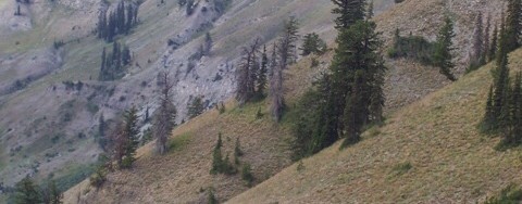 Rick Baugher provides the following: “Richards Peak/Peak 9660 straddles the Idaho/Wyoming border in the Snake River Range. Here are notes from my 6/20/99 visit. From the 6,120 foot trailhead in Blowout Canyon, hike over landslide rubble and faint trail through understory to Spaulding Basin. After a short descent into a gully, bushwhack up the West Slope to the summit of Richards Peak.” USGS Mount Baird