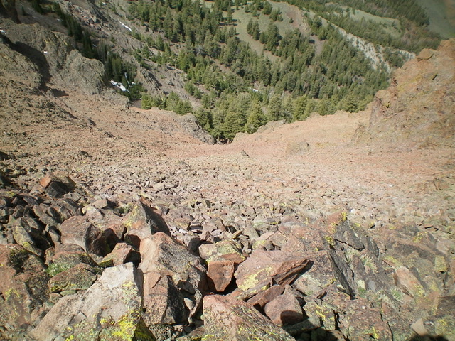 Once atop the headwall at this U-Notch, climb a miserably steep, loose talus slope to get near the summit on the narrow southwest ridge. Thankfully, the upper southwest ridge has much more stable rock than the very loose, upper west face. A quick Class 2+ scramble heading northeast puts you on the cairned summit of Sheep Mountain. This one took some work.
