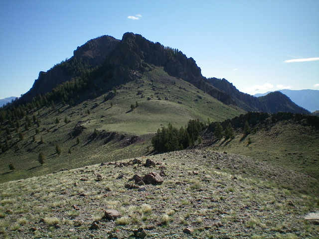 From the 8,660-foot saddle at the base of the southwest ridge cliffs of Sheep Mountain, follow a good elk trail through the thick sagebrush and follow it north then northeast to skirt the left/west side of the ridge cliffs and reach the [hidden] west gully. I could see this gully from the summit of Peak 8909 and could only hope that it would go. But at this point, I was skeptical. Bushwhack right/east up a forested shoulder to find another game trail at the base of the ridge cliffs by which to drop left/north into the gully proper.