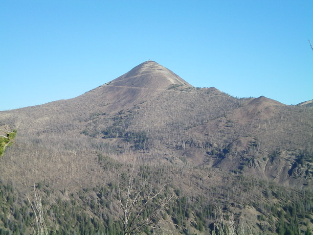 Pass the outhouse and hike up to the base of the fire tower. The north side of the fire tower is the high point of South Twin Peak. There is no summit cairn or USGS benchmark. The north ridge is rarely climbed. The fire lookout manager told me that no one has climbed up the north ridge in the past three summers that he has been manning the tower. Shame, shame. In the “good old days” before there was a road to the top, the rangers lived in the guard station (where I parked) and hiked up the north ridge daily to do their fire tower duties. Not anymore.
