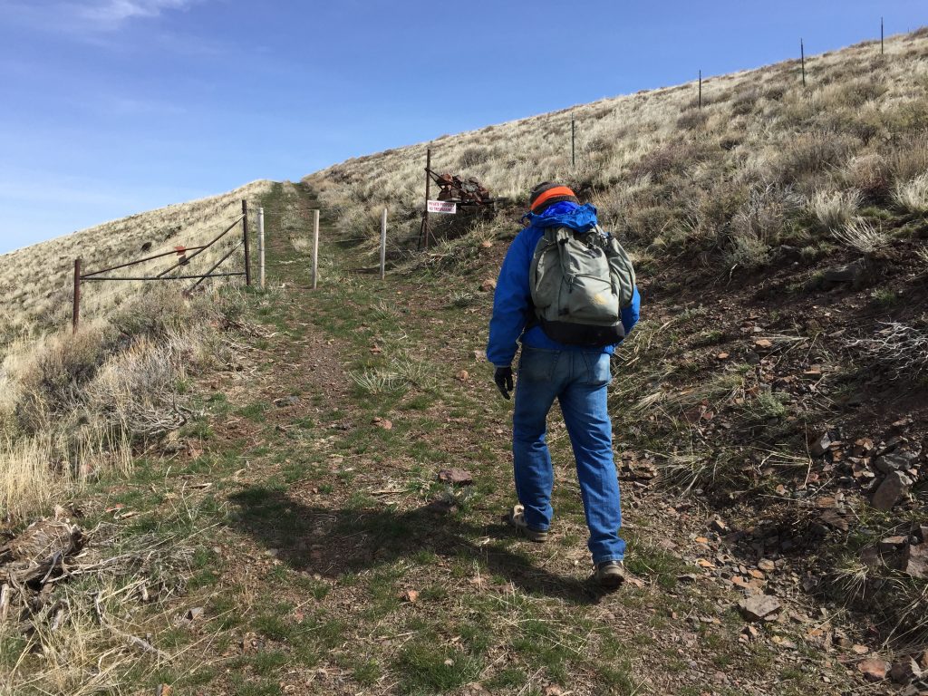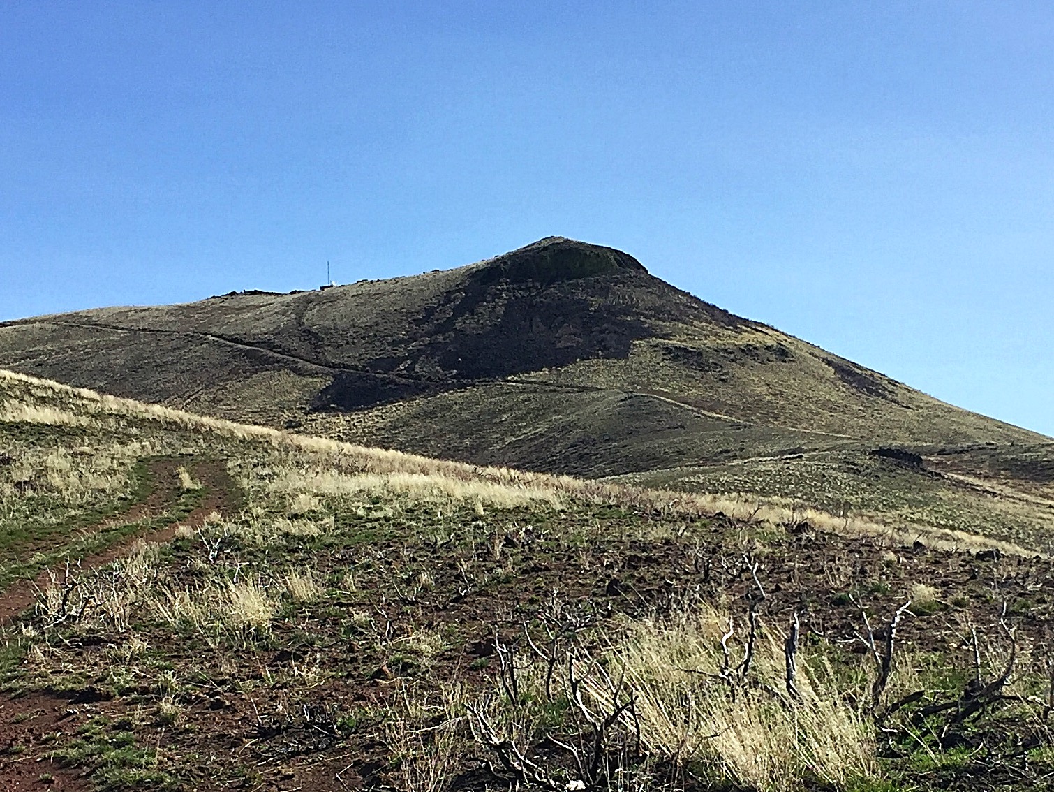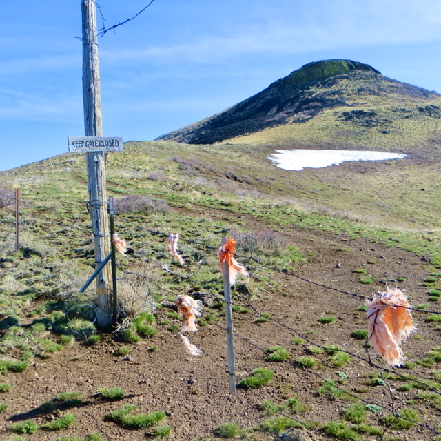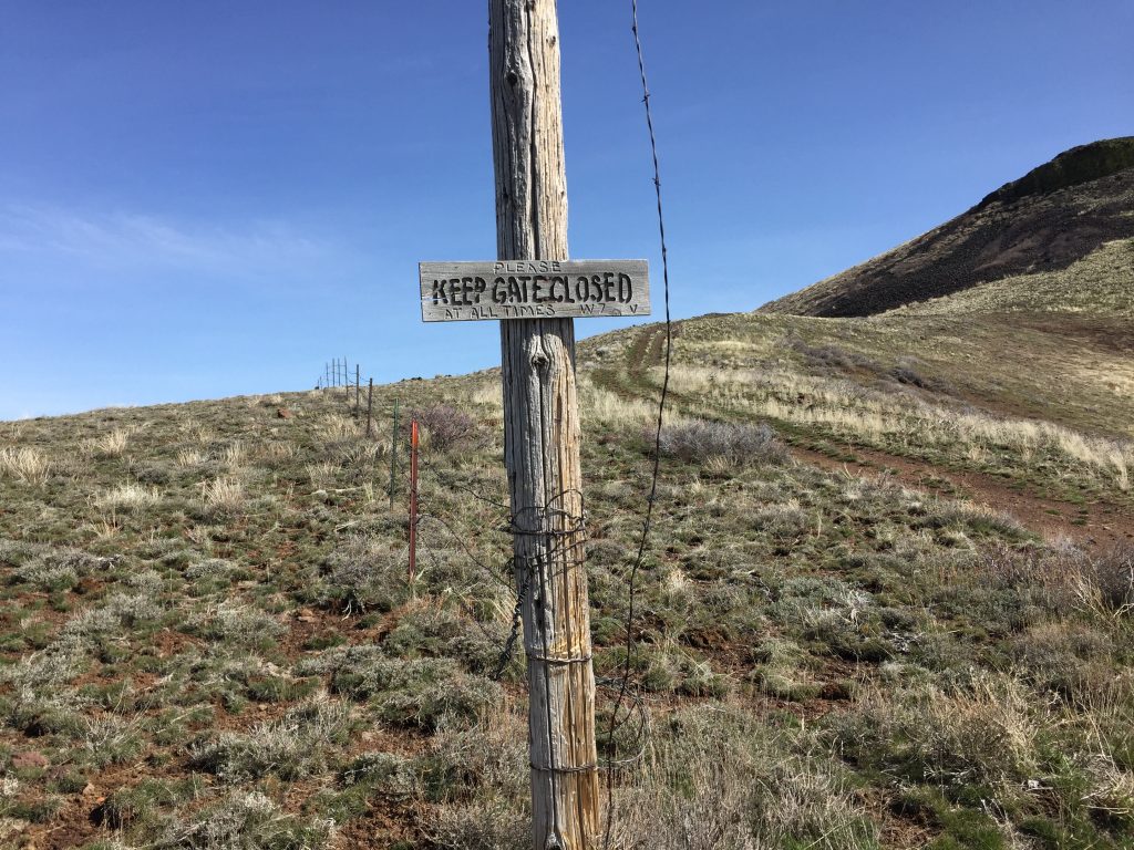 This peak is not in the book. Access is now apparently closed to the public. In April 2017, there were no “Private Property-No Trespassing” signs or orange paint markings notifying you that the property is private and thus cutting off access. Margo Mandella reports that on April 23rd, 2021 that “The second gate at the public/private boundary (slightly higher than 6400 ft elevation at 43.260559, -116.887817) is now flagged in orange and fence posts next to the gate are also painted orange. Thus, sorry to report, there is no longer any public access to this 1k prominence peak.” Updated April 2021