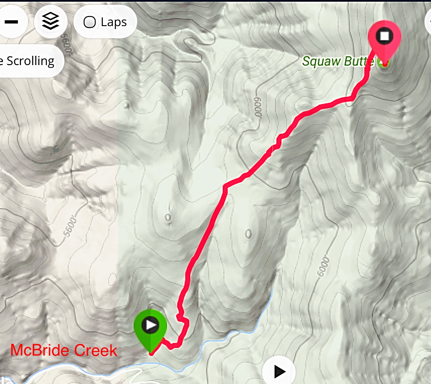 Squaw Butte is accessed from US-95. Access begins at Milepost 7 on a good gravel road, which runs southeast from the highway toward the mountains. The road is unsigned. Follow the road southeast past a reservoir fed by Little McBride Creek and then into the McBride Creek drainage below Flattop Butte. The road enters the McBride Creek Canyon at this point. Follow the road up the canyon roughly 2 miles to an unsigned road fork. Take the left fork, which quickly crosses the creek. The right fork leaves the creek bottom at this point, so if you start climbing you should know you missed the turn. There is a nice flat parking area about 100 yards after the creek crossing.