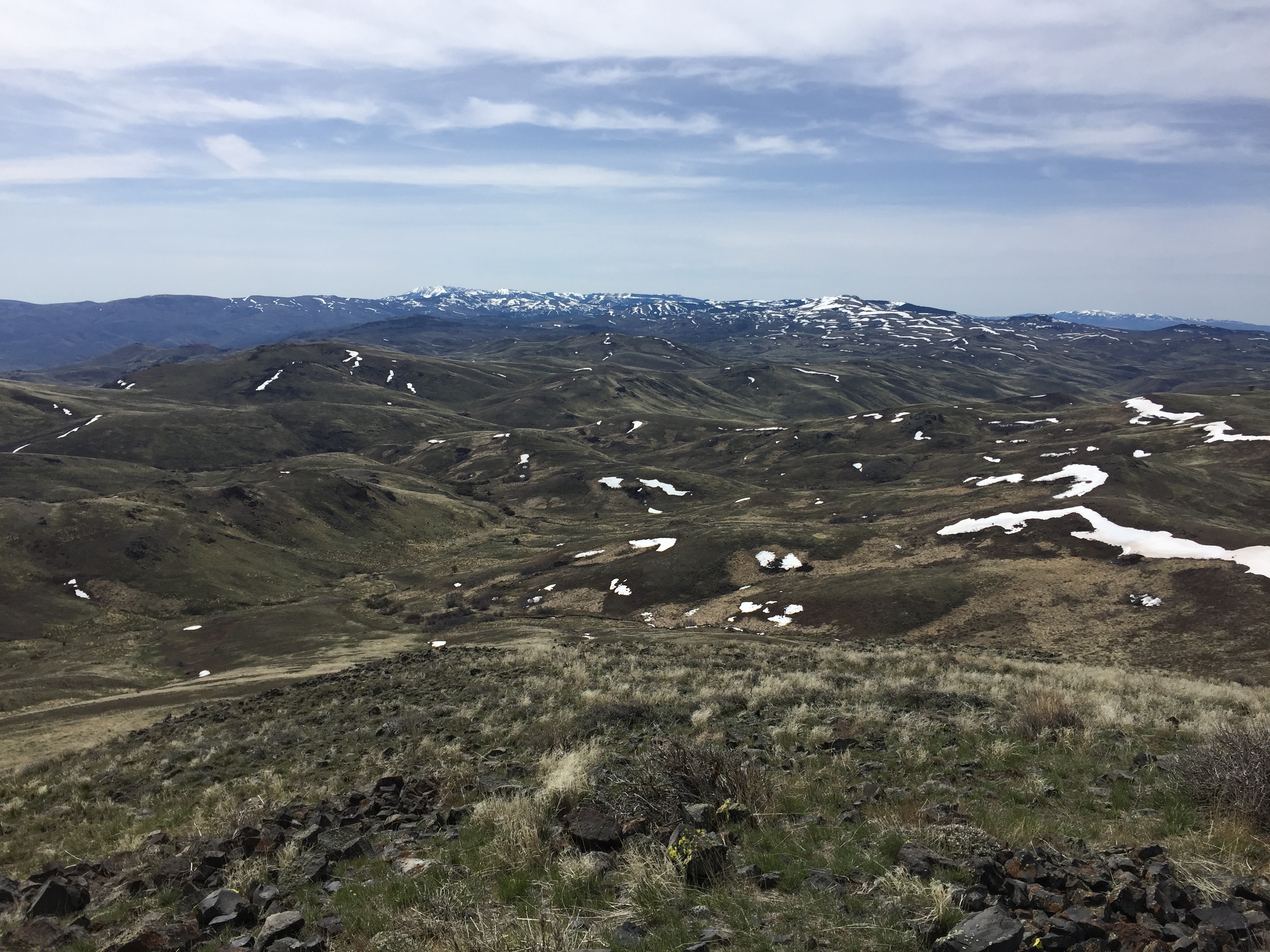 In addition to the Owyhee Mountains, the summit view takes in the Boise Mountains and West Mountains in Idaho, as well as the Wallowas, Elkhorns, Steens and Pueblos in Oregon in addition to several Nevada mountain ranges. My GPS reported 2.4 miles with 1,434 feet of elevation gain.