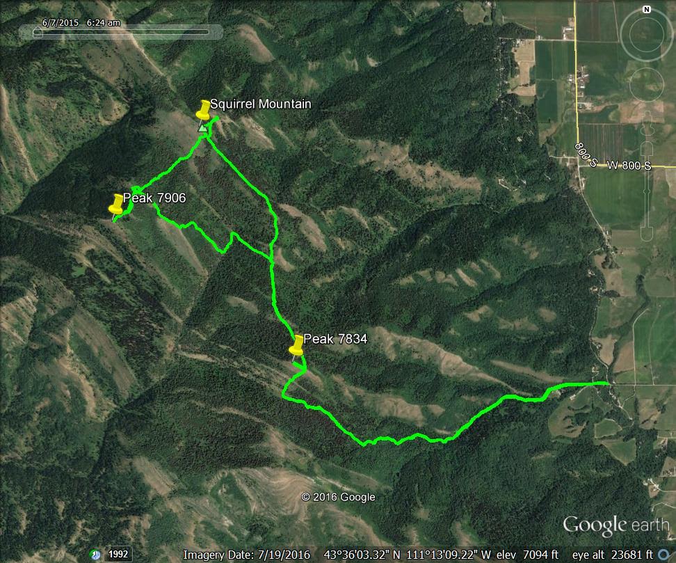 We climbed Peak 7834, Peak 7906 and Squirrel Mountain, in that order, as a loop from the east via Drake Creek, as shown in the GPS track below. However, the Grove Creek trail, a little farther north of Drake Creek, provides more direct access to Squirrel Mountain if that is your only destination.